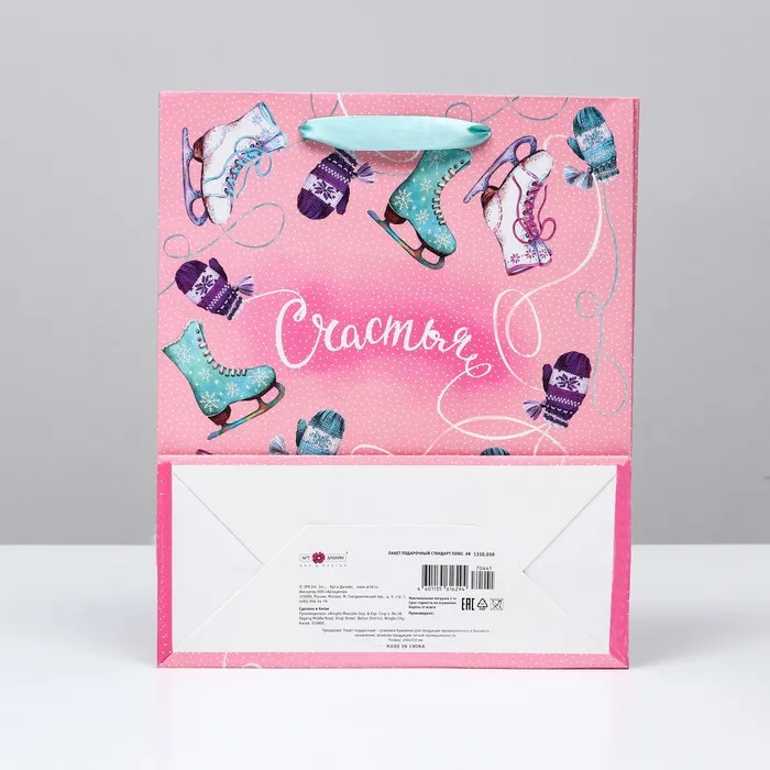 Новогодний подарочный пакет с ярким, красочным рисунком создаст праздничное настроение.