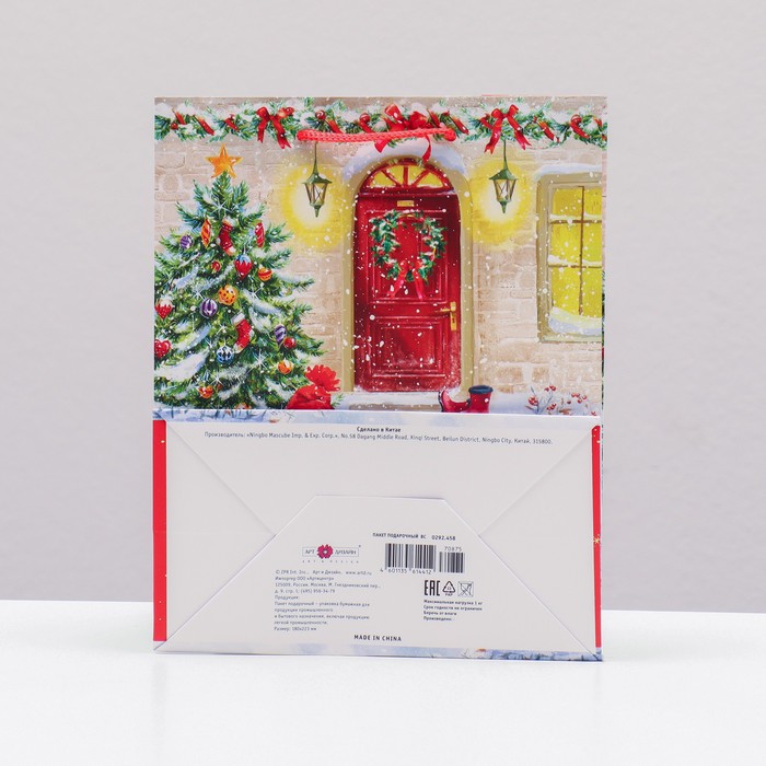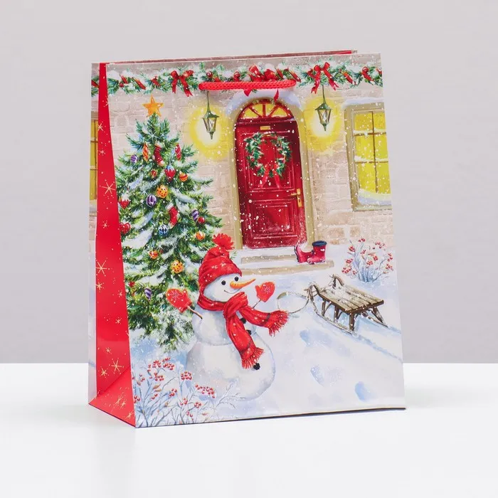 Новогодний подарочный пакет с ярким, красочным рисунком создаст праздничное настроение.