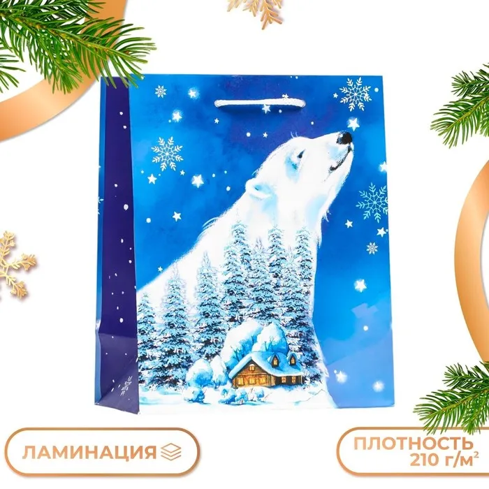 Новогодний подарочный пакет с ярким, красочным рисунком создаст праздничное настроение.