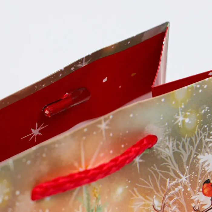 Пакет имеет плотную структуру и приятную на ощупь поверхность, что делает его удобным в использовании. Он украшен яркими новогодними узорами и изображениями, которые создают атмосферу праздника и волшебства.
