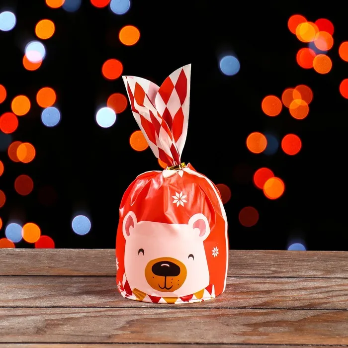 - Трогательный дизайн: Новогодний мишка на красном фоне выглядит по-домашнему уютно. Ушки добавляют пакету миловидности — такой подарок понравится детям.