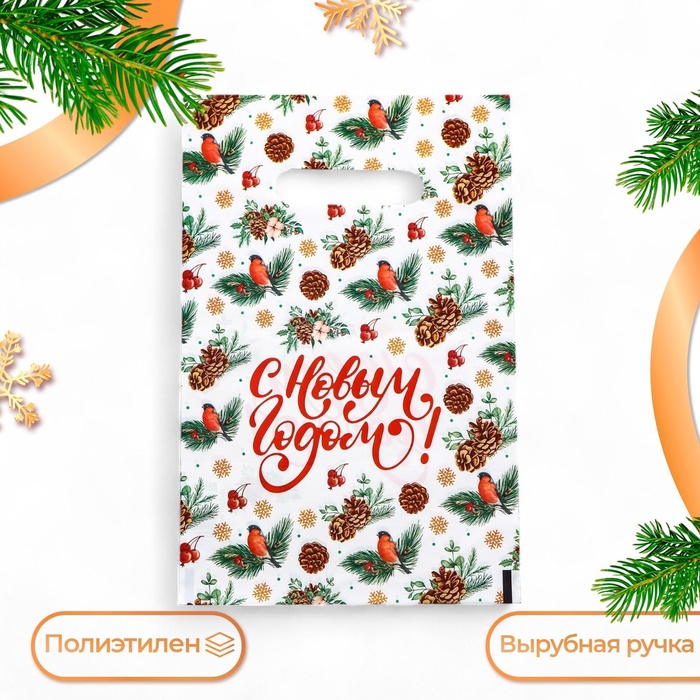 Пакет полиэтиленовый с вырубной ручкой "С Новым годом, снегири", 20×30 см — Характеристики