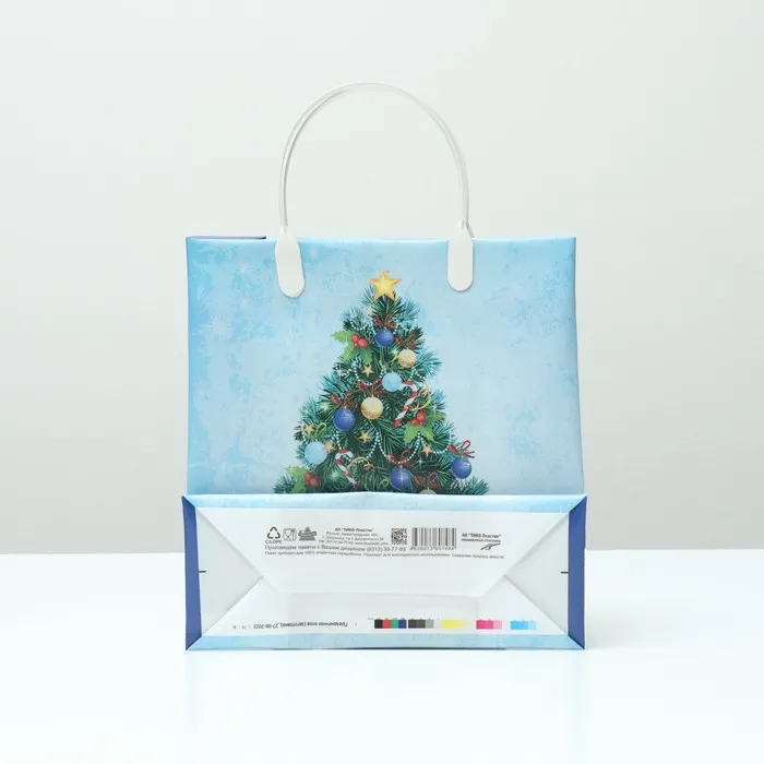 Новогодний подарочный пакет с ярким, красочным рисунком создаст праздничное настроение.