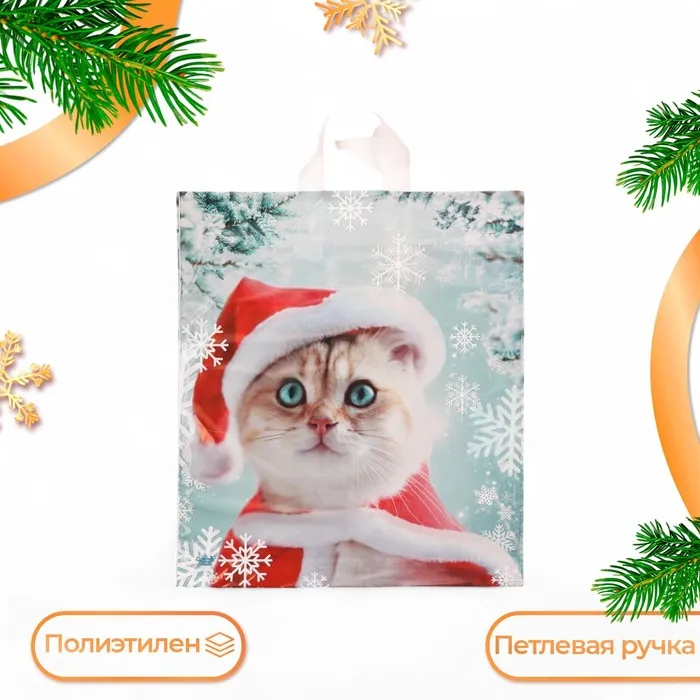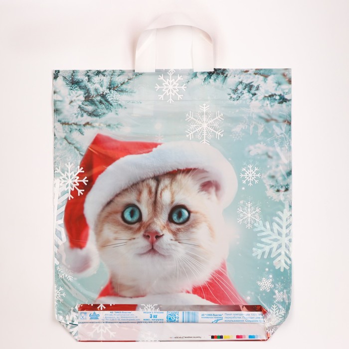 Пакет имеет яркий и красочный дизайн с новогодними мотивами, такими как снежинки, елки, Дед Мороз и другие символы Нового года. Петлевая ручка обеспечивает удобство переноски и использования.