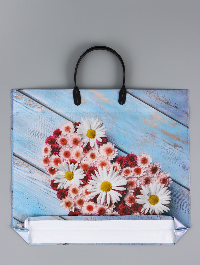 Прочность в романтичном стиле. Пакет «Ромашковое сердце» с пластиковой ручкой, 38x34 см — это сверхплотная и вместительная упаковка с нежным дизайном. Ее усиленная конструкция рассчитана на ценные и тяжелые подарки женщинам и девочкам.