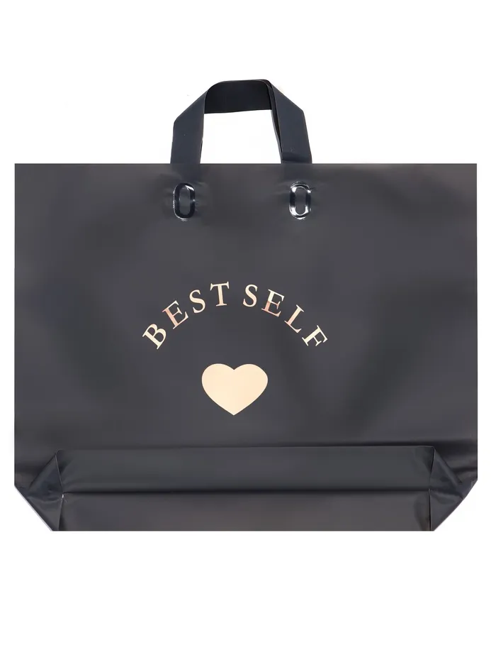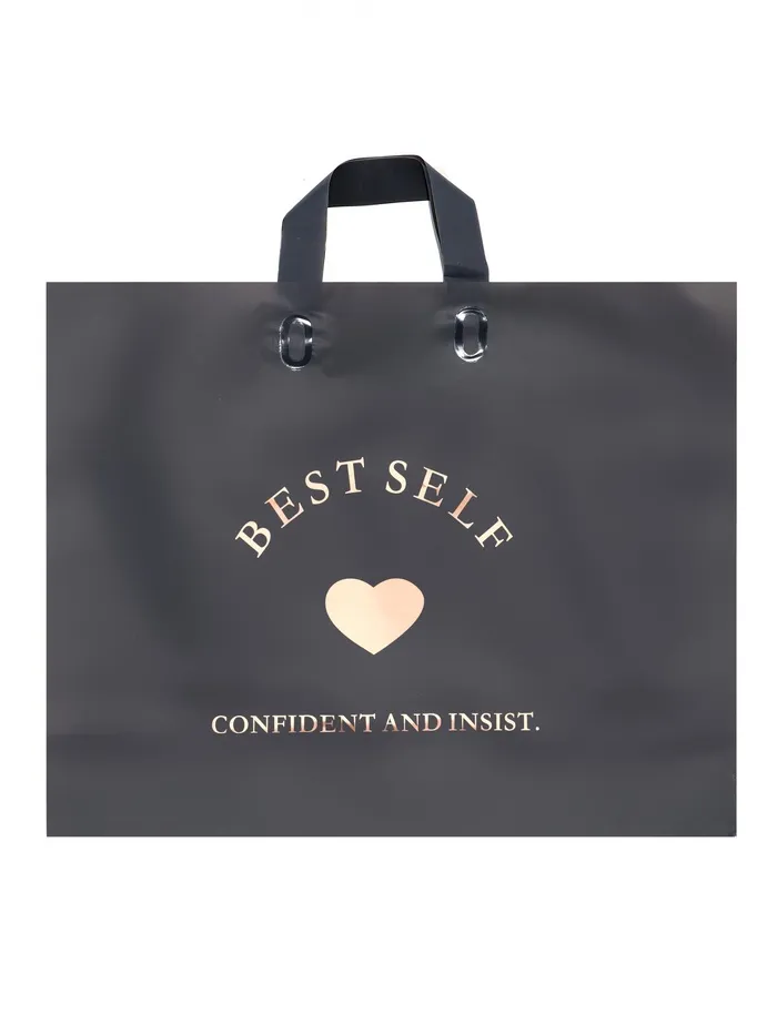 Чёрный пакет с петлевой ручкой — это универсальный аксессуар для повседневного использования. Его увеличенный размер и прочный материал делают его идеальным для переноски крупных покупок или хранения вещей. Благодаря лаконичному дизайну с надписями, цифрами и сердечками пакет подходит для любых ситуаций, сохраняя при этом стильный внешний вид.
