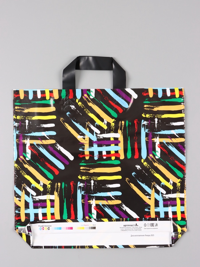 - Плотный материал 70 мкм: Полиэтилен ПВД такой толщины выдерживает нагрузку и не рвется по швам. Глянцевые разноцветные линии ярко выделяются на матовом черном фоне, создавая эффектный контраст.