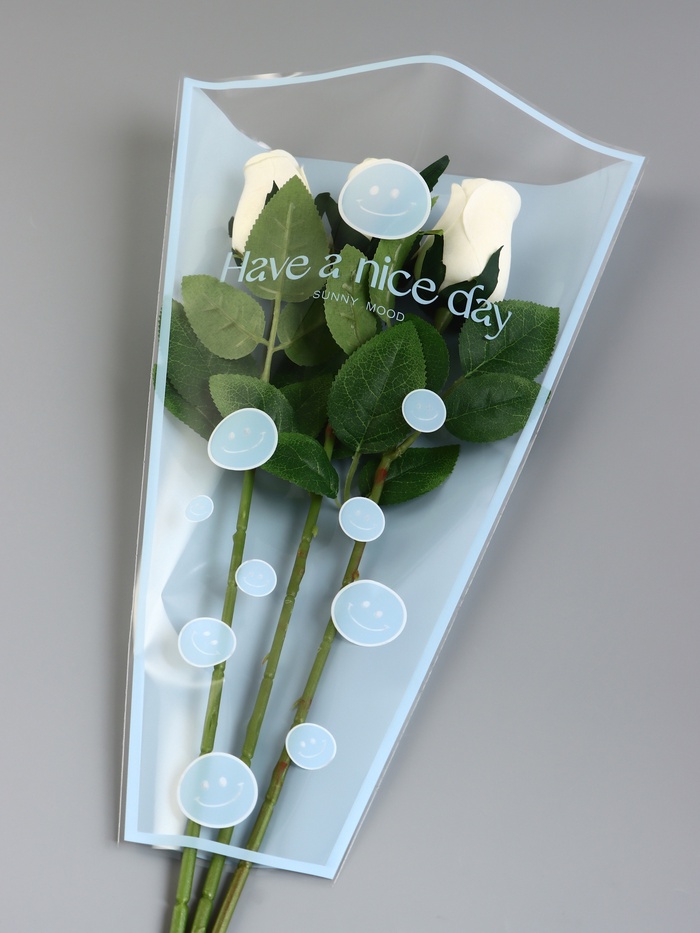 Почему выбирают этот конус: Он сочетает практичность и оригинальный дизайн. Голубой цвет с веселыми смайлами создает позитивное настроение, а качественный материал гарантирует сохранность букета. Отличный выбор для тех, кто любит необычные решения!