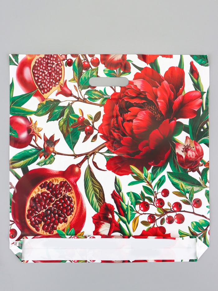- Необычный дизайн с ботанической тематикой: Цветок и плод граната — это менее распространённый, но очень выразительный мотив. Он ассоциируется с югом, теплом, плодородием и яркой красотой. Такой пакет подходит для подарка женщине с ярким вкусом, которая оценит небанальный подход.