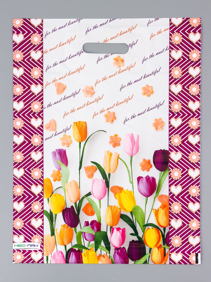 - Усиленная петлевая ручка: Широкая ручка из плотного полиэтилена выдерживает вес объемного подарка. Ее удобно держать в руке, а конструкция сохраняет форму даже при переноске на большое расстояние.