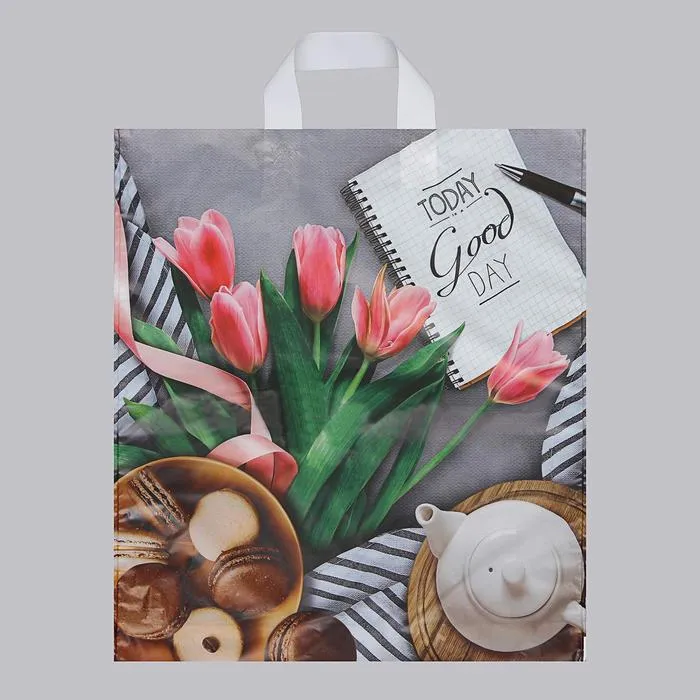 Пакет полиэтиленовый с петлевой ручкой, прочный с оригинальным рисунком.