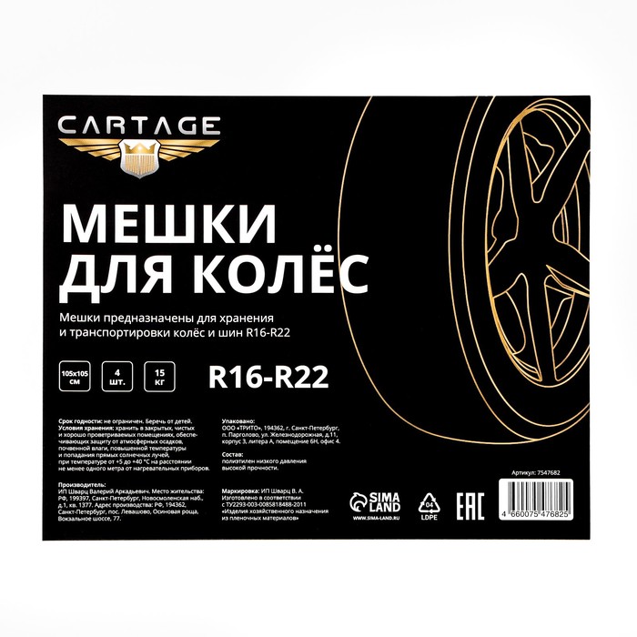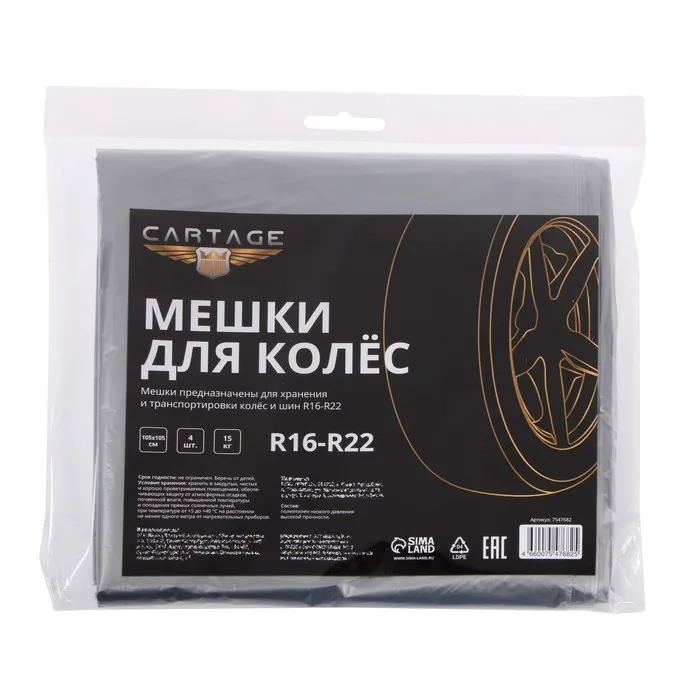 Пакеты для шин и колёс Cartage, R=16-R=22, 105×105 см, набор 4 шт. — Характеристики