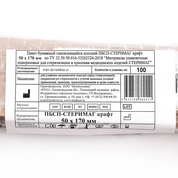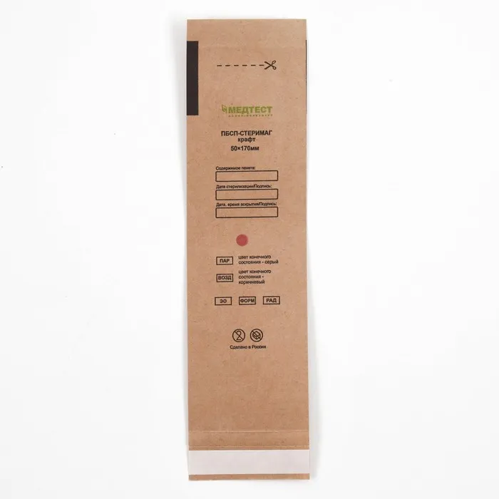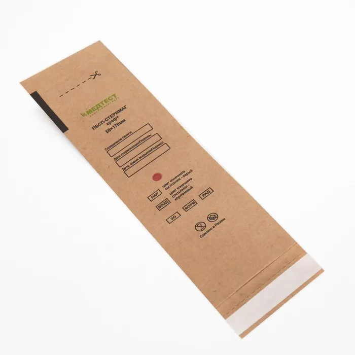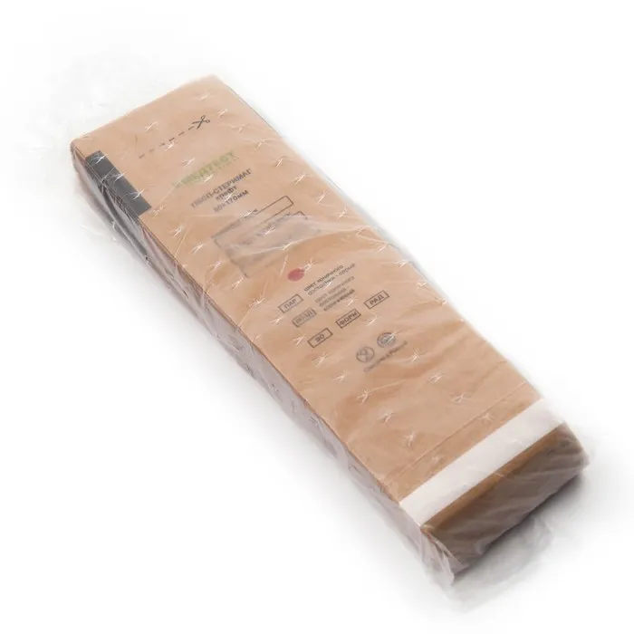 Пакеты из крафт-бумаги самоклеящиеся для паровой, воздушной, этиленоксидной стерилизации легко проницаемы для соответствующих стерилизующих агентов, в закрытом виде непроницаемы для микроорганизмов.