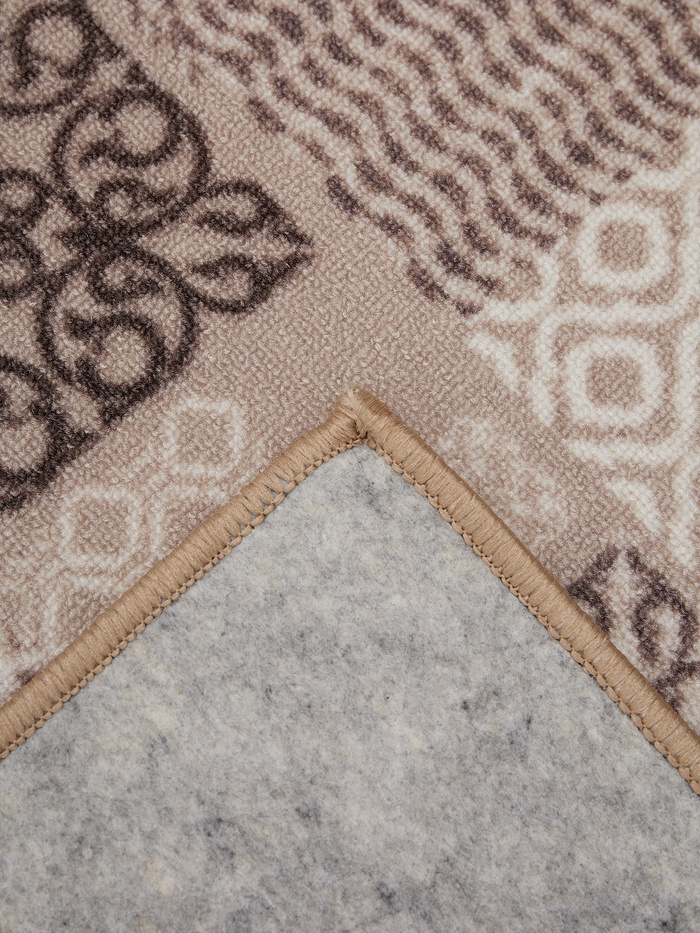 Этот прямоугольный ковёр-палас создаёт в комнате атмосферу спокойствия и порядка. Его геометрический узор, выдержанный в тёплых бежево-коричневых тонах, вносит в интерьер ненавязчивую графичность и стиль. Низкий ворс из износостойкого полиамида на войлочной основе делает уход простым, а перемещение по поверхности — комфортным и бесшумным.