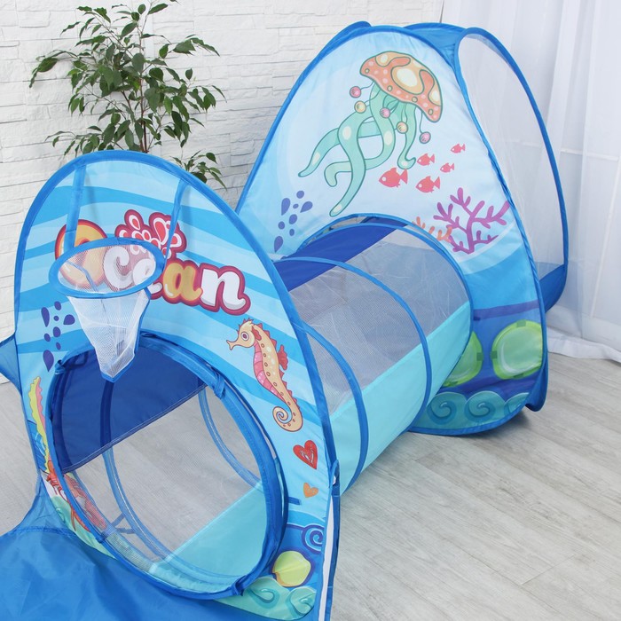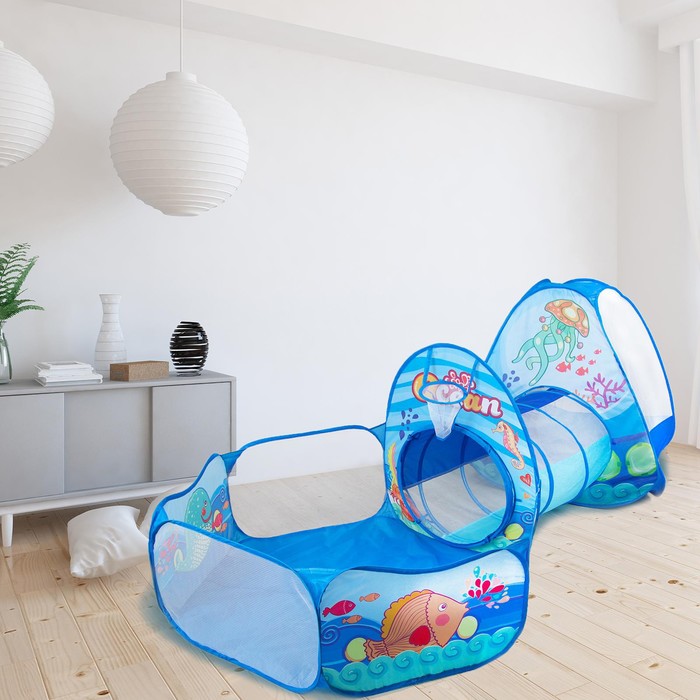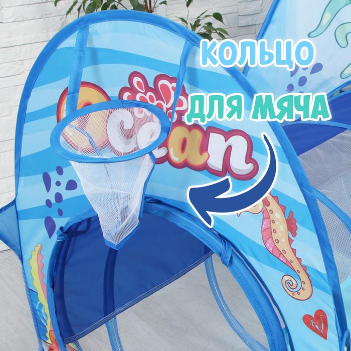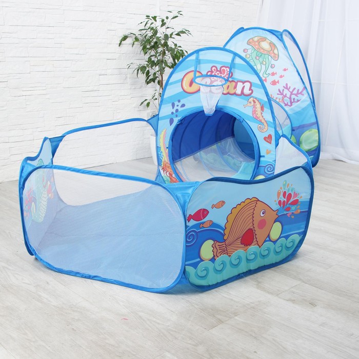 Яркая игровая зона, состоящая из палатки, тоннеля и бассейна создана для активных игр дома и на улице. Она поможет разнообразить игровую активность ребёнка и развить координацию движений и воображение. Дети могут использовать элементы набора для пряток, ползания и других подвижных игр.