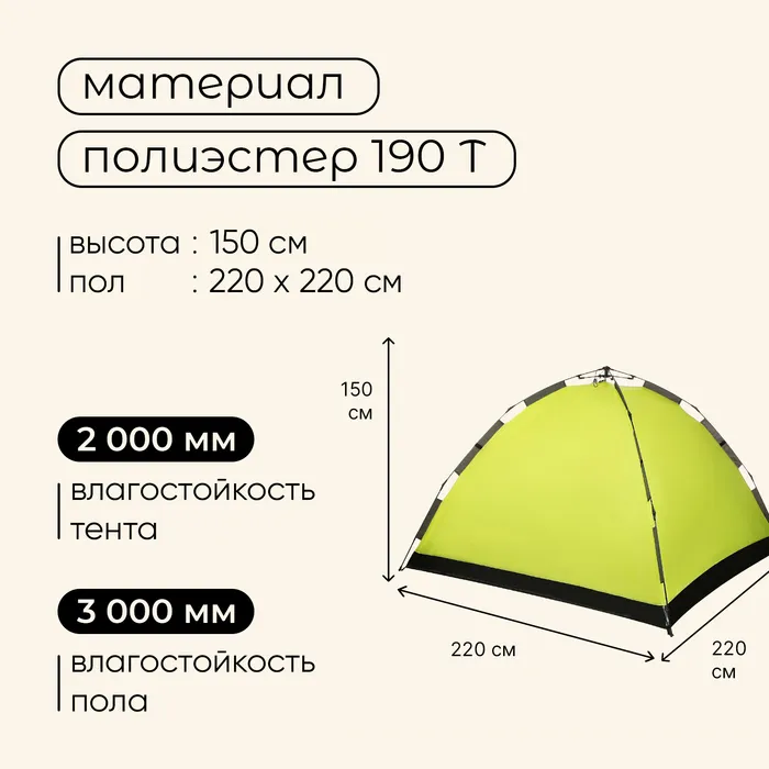 Палатка туристическая 3-местная maclay SWIFT 3, 220×220×150 см, автоматическая, трекинговая, однослойная, зелёная — Характеристики