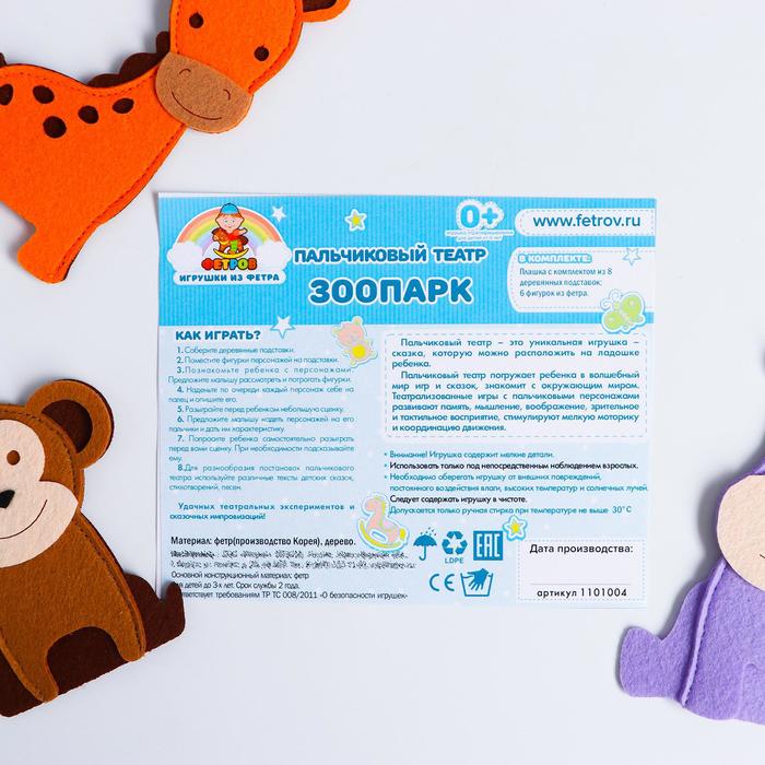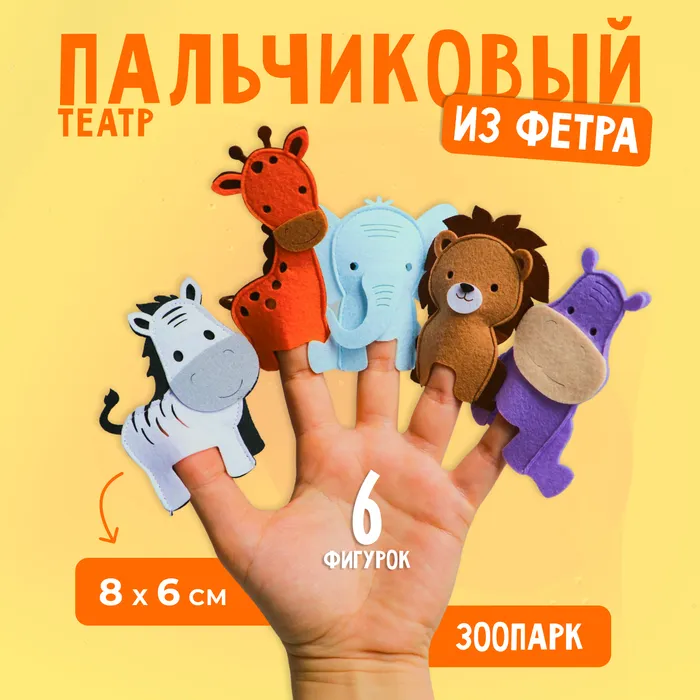 Пальчиковый театр — это игрушка-сказка, которая легко помещается на ладошке ребёнка. Пальчиковый театр «Зоопарк» подарит ребёнку сказочный мир игр, познакомит с замечательными персонажами экзотических животных. В наборе вы найдёте зебру, жирафа, слона, бегемота, льва и обезьянку. Каждого персонажа можно установить на деревянные подставочки и расставить на столе или надеть на пальчики ребёнка и устроить театральную импровизацию или сюжетную игру.