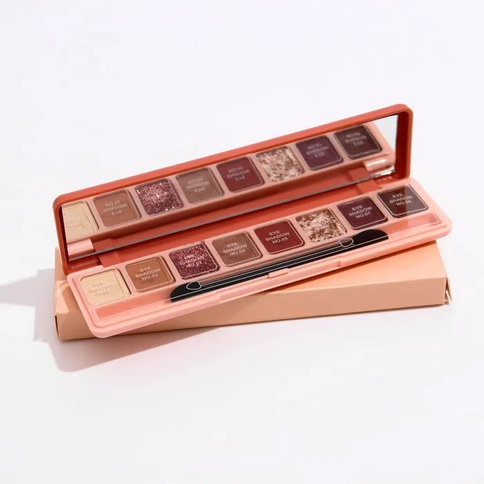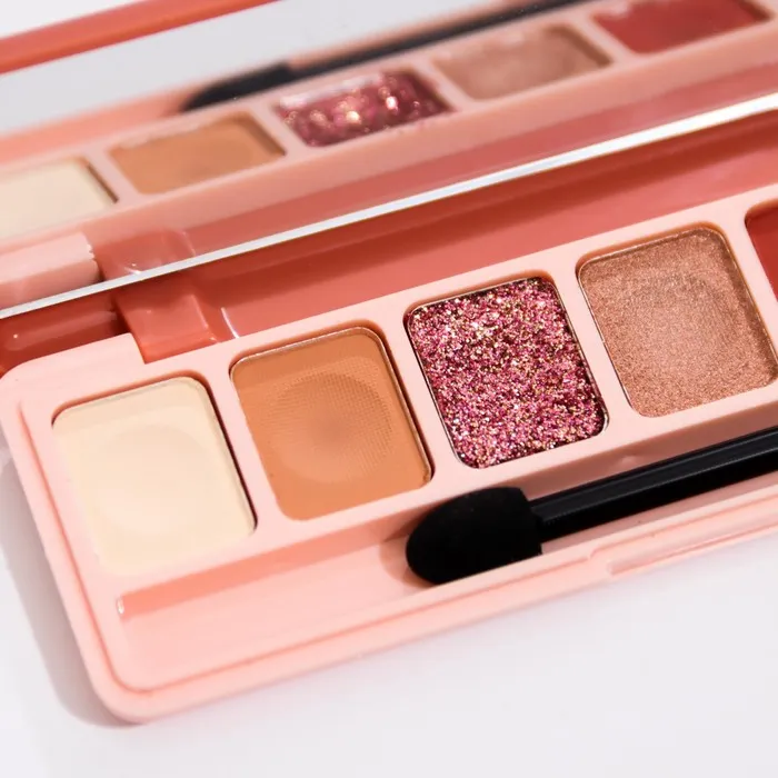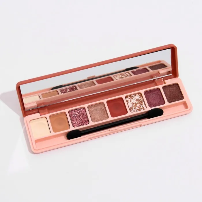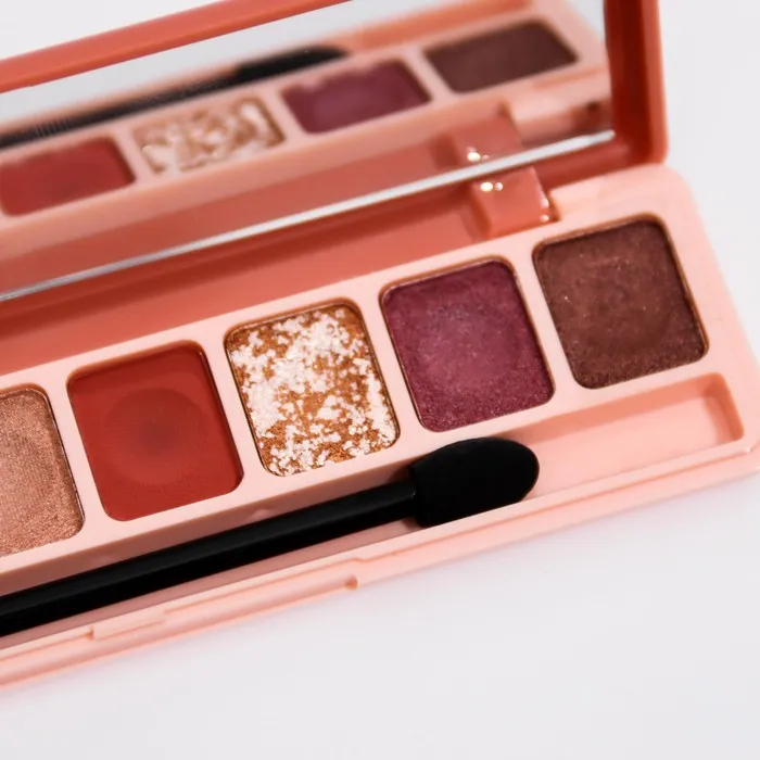Палетка теней имеет удобную форму и хороший выбор цветов, в том числе блестящих. Тени хорошо пигментированы, не пылят, не скатываются, отлично тушуются и наносятся на веки.