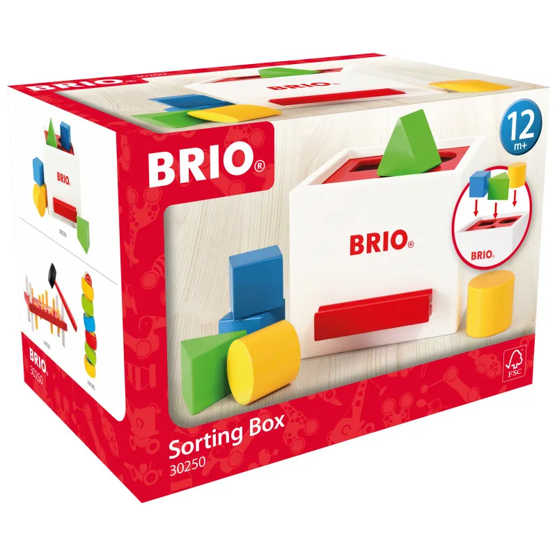 Классическая деревянная коробка с кубиками для изучения форм. Шесть ярких фигурок и соответствующие отверстия на крышке коробки. Кубики можно легко извлечь и использовать снова благодаря открывающемуся дну коробки.