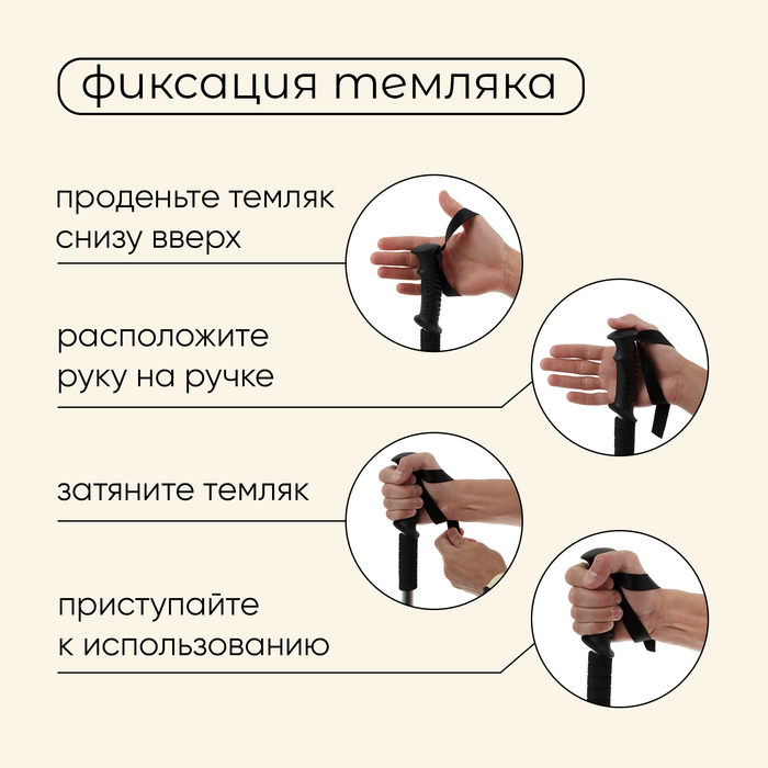 - Темляк огибает запястье, обеспечивая опору для руки и предотвращая потерю палки во время движения. Конструкция петли позволяет отрегулировать необходимую длину.