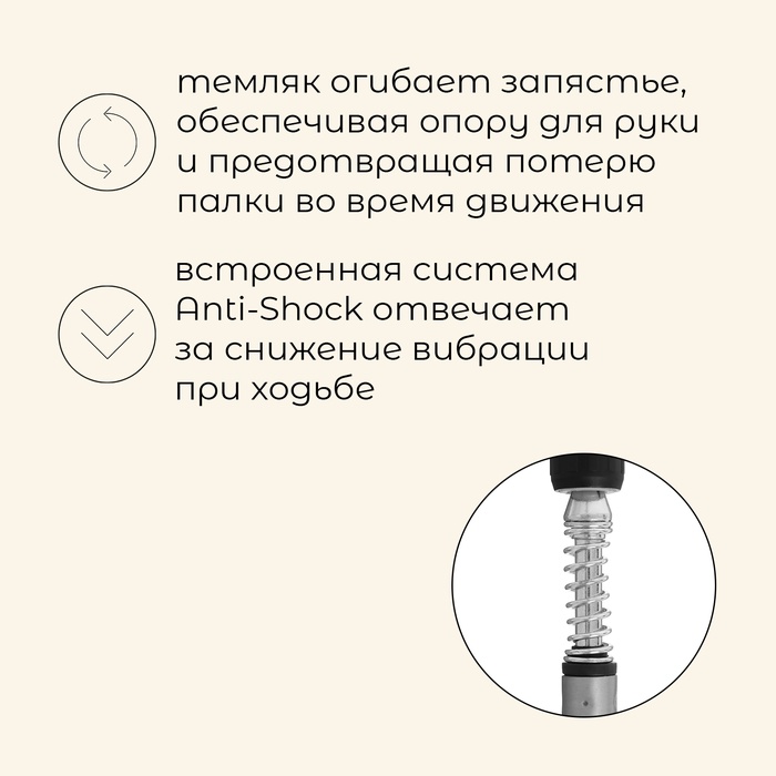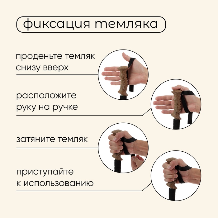 - Темляк огибает запястье, обеспечивая опору для руки и предотвращая потерю палки во время движения. Конструкция петли позволяет отрегулировать необходимую длину.