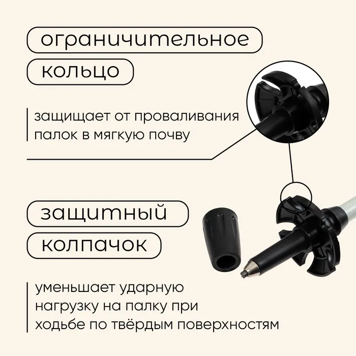 - Модель оснащена ограничительным кольцом для предотвращения проваливания палок в мягкую почву и застревания между камнями.
