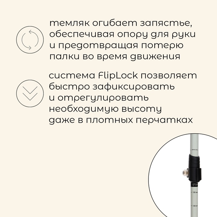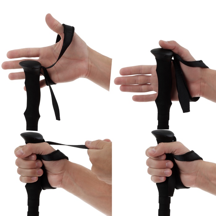 - Темляк огибает запястье, обеспечивая опору для руки и предотвращая потерю палки во время движения. Конструкция петли позволяет отрегулировать необходимую длину.