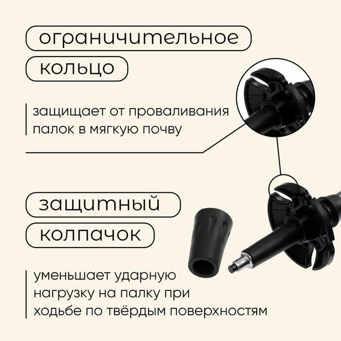 - Модель оснащена ограничительным кольцом для предотвращения проваливания палок в мягкую почву и застревания между камнями.