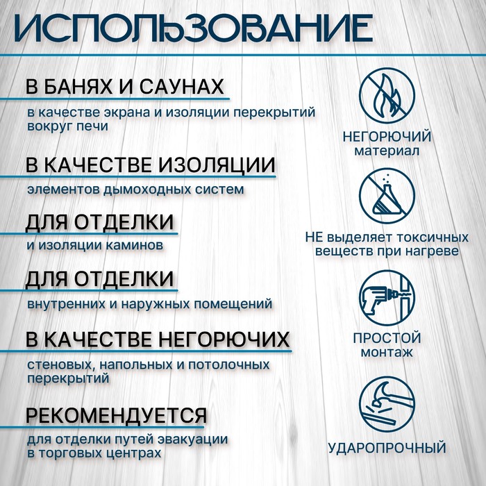 Определяющие характеристики материала это — абсолютная влагостойкость в сочетании с огнестойкостью. При нагревании он не выделяет токсичных веществ, отличается стойкостью к любым химическим реагентам, а в случае намокания не изменяет своих геометрических размеров.