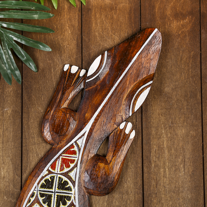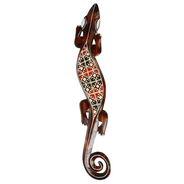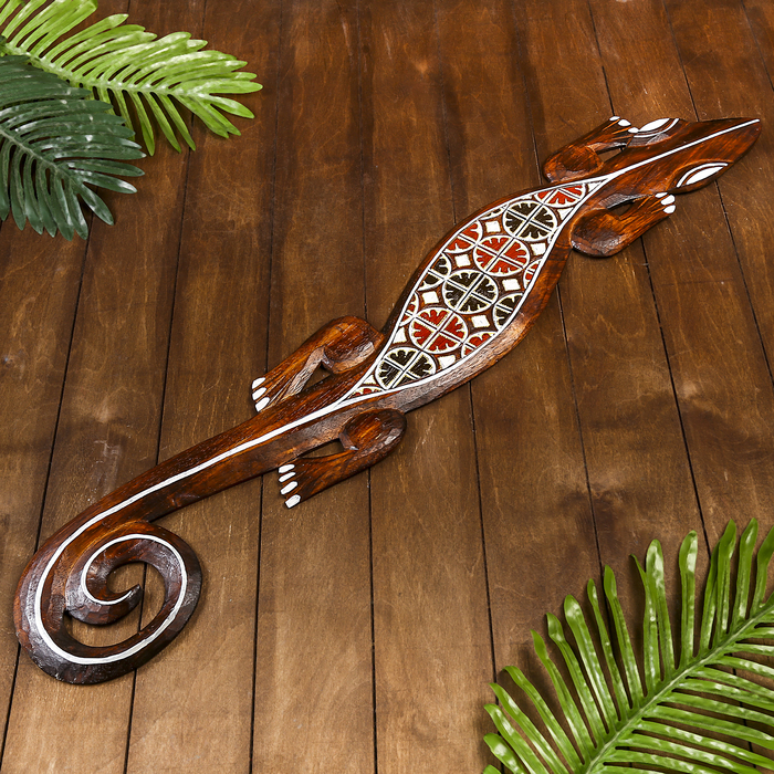 Не каждый осмелится разместить такое панно ручной работы в своем интерьере. Ведь порой кажется, что это настоящая живая рептилия. Искусные индонезийские мастера изобразили всё настолько детализировано четко, что хочется прикоснуться к панно «Геккон», 100×17×1 см, дерево и ощутить тонкие линии изгибов этой «ящерицы счастья».