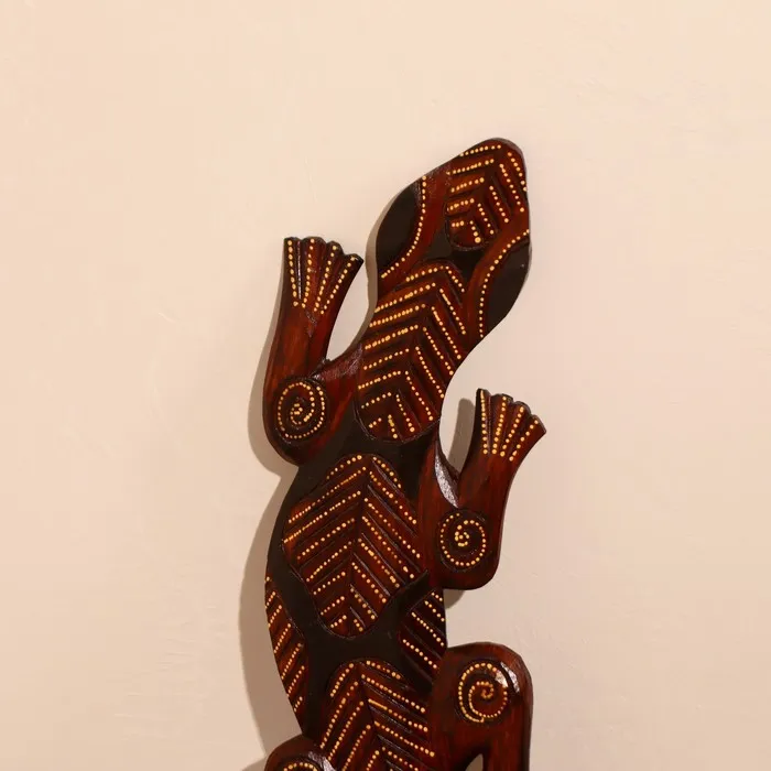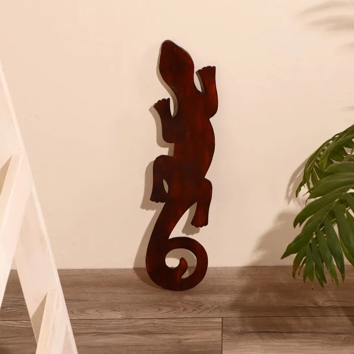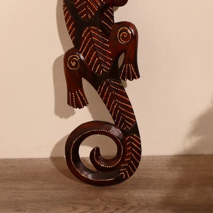 Не каждый осмелится разместить такое панно ручной работы в своем интерьере. Ведь порой кажется, что это настоящая живая рептилия. Искусные индонезийские мастера изобразили всё настолько детализировано четко, что хочется прикоснуться к панно «Геккон», 50×13×1 см, дерево и ощутить тонкие линии изгибов этой «ящерицы счастья».