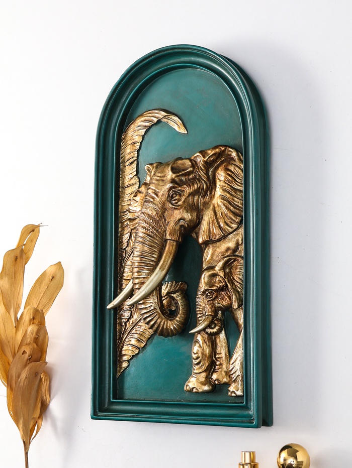 Это настенное панно с изображением слонов привносит в интерьер дух дикой природы и ощущение спокойной силы. Композиция из величественных животных в густых джунглях, выполненная в благородной зелёно-золотой палитре, создаёт атмосферу гармонии и служит сильным декоративным акцентом.