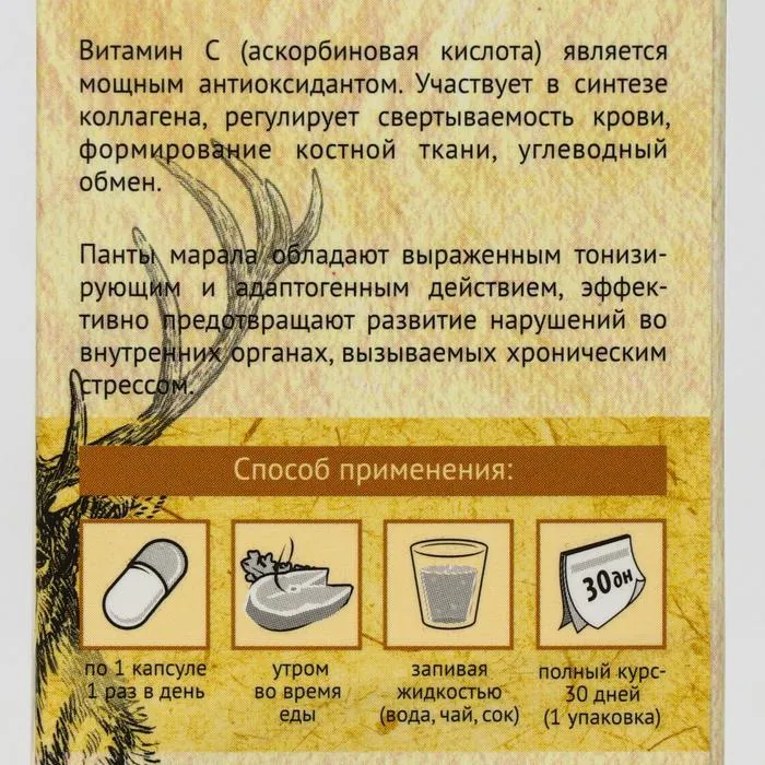 Состав: пантогематоген, панты марала, аскорбиновая кислота.