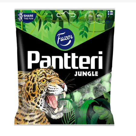 Pantteri Jungle - это сладко-соленый лакричник. Pantteri Jungly Mix содержит три разных вкуса в удобной упаковке: красный апельсин с ментолом, сладкая и соленая лакрица. Попробуйте сами или поделитесь с друзьями!