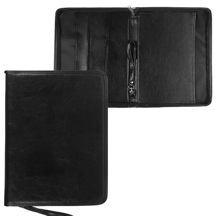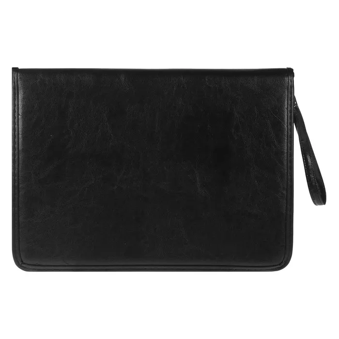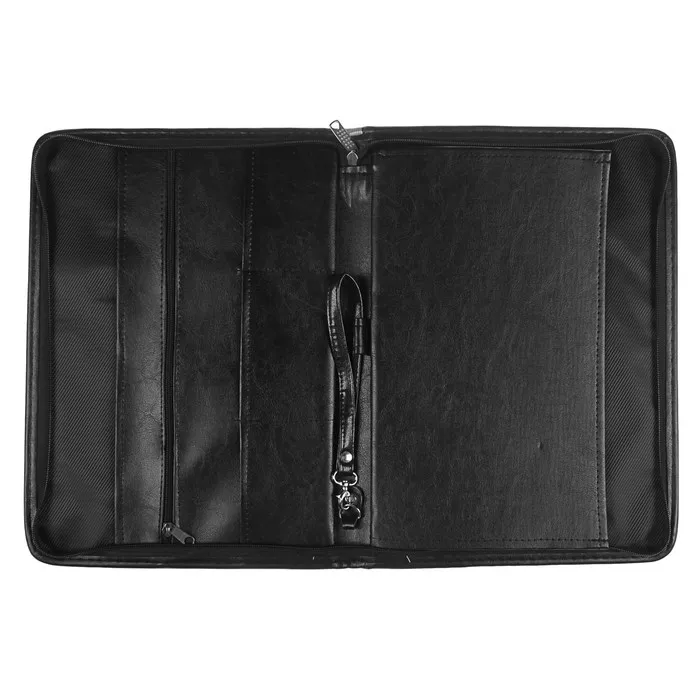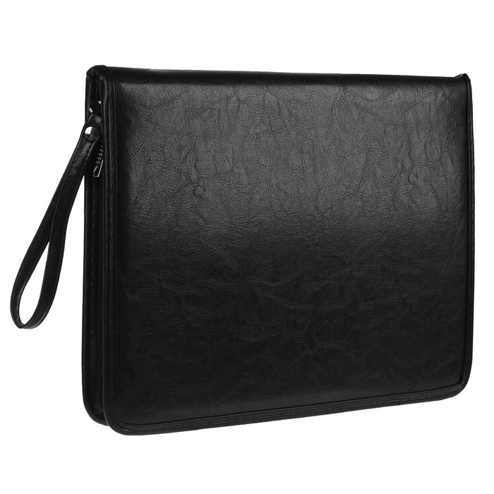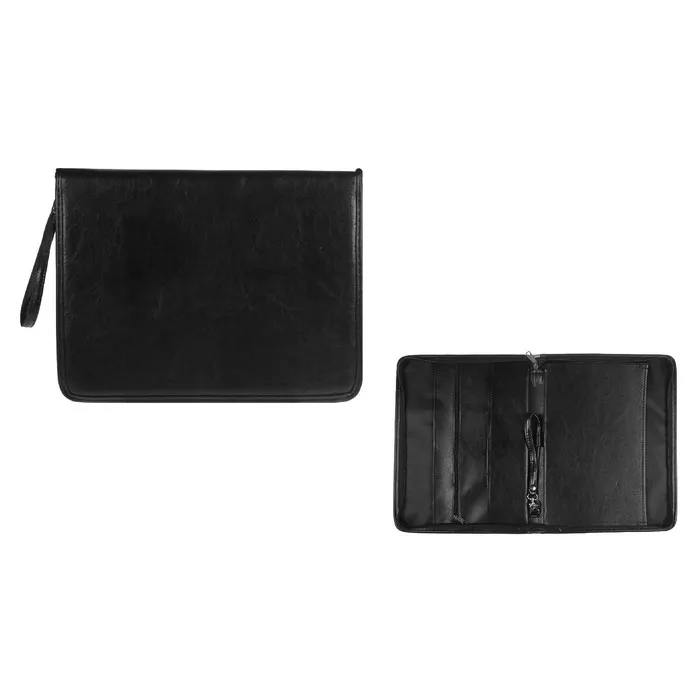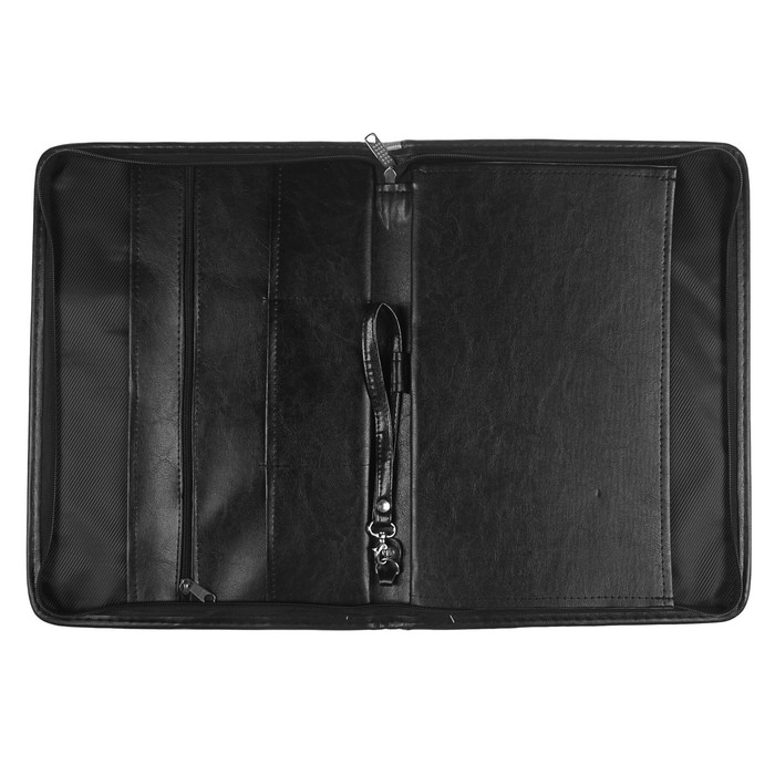 Представительная деловая папка на молнии. Изготовлена из черного К/З Люкс. Размер изделия 260 на 360 мм. Толщина папки 30 мм. Внутри расположено удобных, вместительных 2 кармана плюс карман на молнии и 3 кармашка под визитки. Удобная ручка в виде петли.