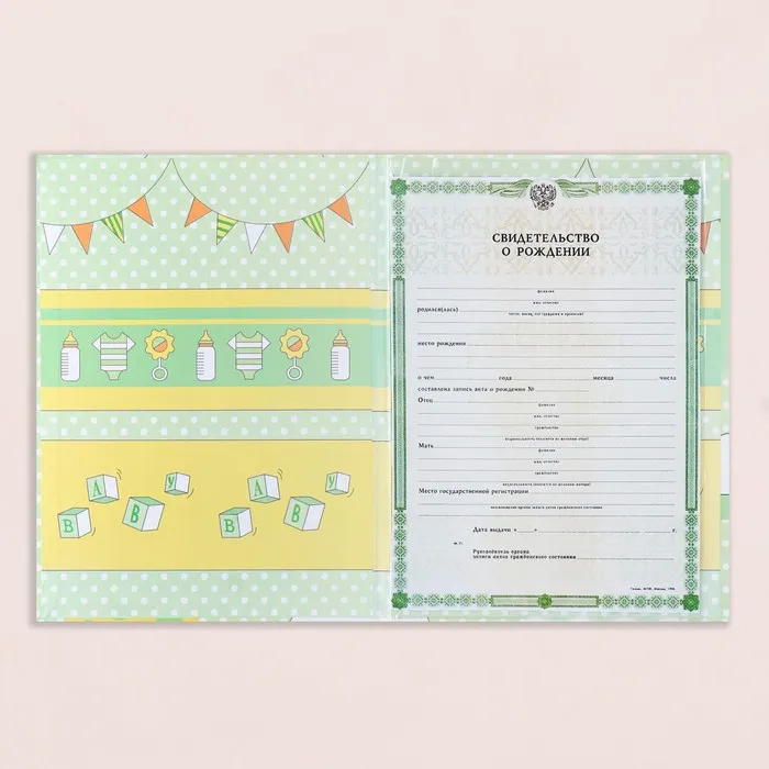Свидетельство о рождении «Игрушки» ламинированное, А4