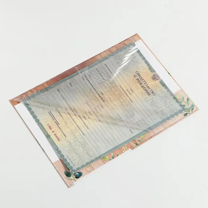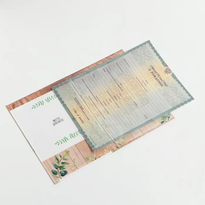 Обложка для свидетельства о рождении А5— полезный аксессуар, позволяющий хранить первый важный документ ребёнка в целости и сохранности. Материал обложки выполнен из плотного переплётного картона 1,25 мм, приятен на ощупь. Внутри — плотный файл размером А4. В такой обложке документ сохранится и не помнётся даже при активном использовании. Папка для свидетельства о рождении станет приятным и нужным подарком молодым родителям.