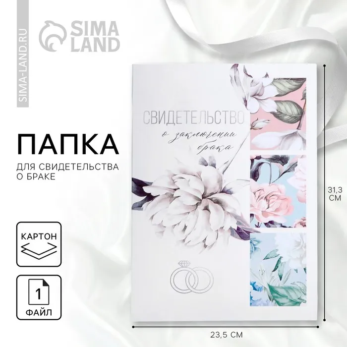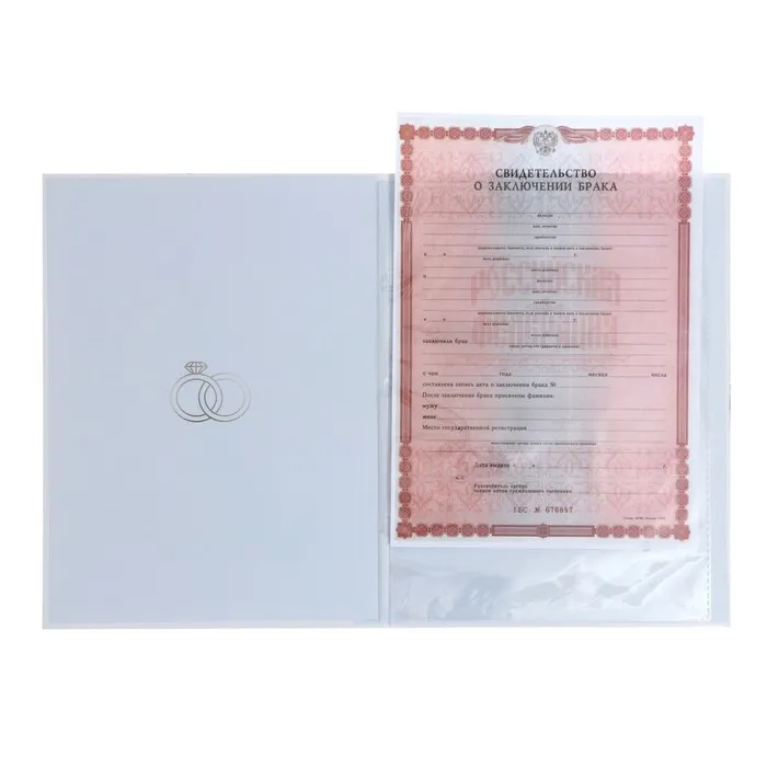 Обложка для свидетельства о заключении брака формата А5 станет лучшим обрамлением для вашего первого совместного документа. Красивая свадебная папка подчеркнёт всю торжественность бракосочетания, она будет напоминать вам о светлом дне свадьбы. В такой папке ваш семейный документ не помнётся, не испачкается и будет сохранять свою красоту всю жизнь. Оригинальный дизайн папки создаст отличное настроение новобрачным и станет хорошим презентом на свадьбу или её годовщину. Папка выполнена из плотного переплётного картона 1,25 мм. Папка с файлом А4.