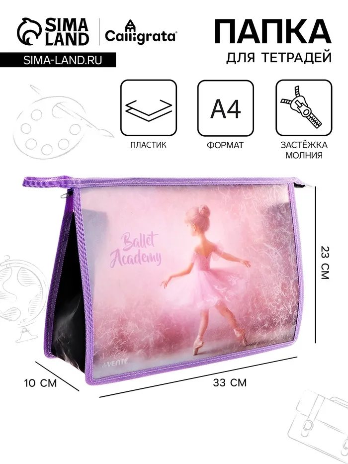 Папка для тетрадей А4, 330x230x100 мм, deVENTE "Ballet Academy", молния сверху, пластиковая, для девочки — Характеристики