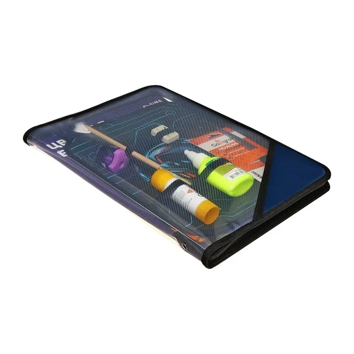 - Надежная защита и организация: Благодаря крепкой пластиковой конструкции с откидной планкой, все содержимое будет надежно защищено от внешних воздействий. Молния вокруг папки обеспечивает удобство доступа ко всему комплекту.
