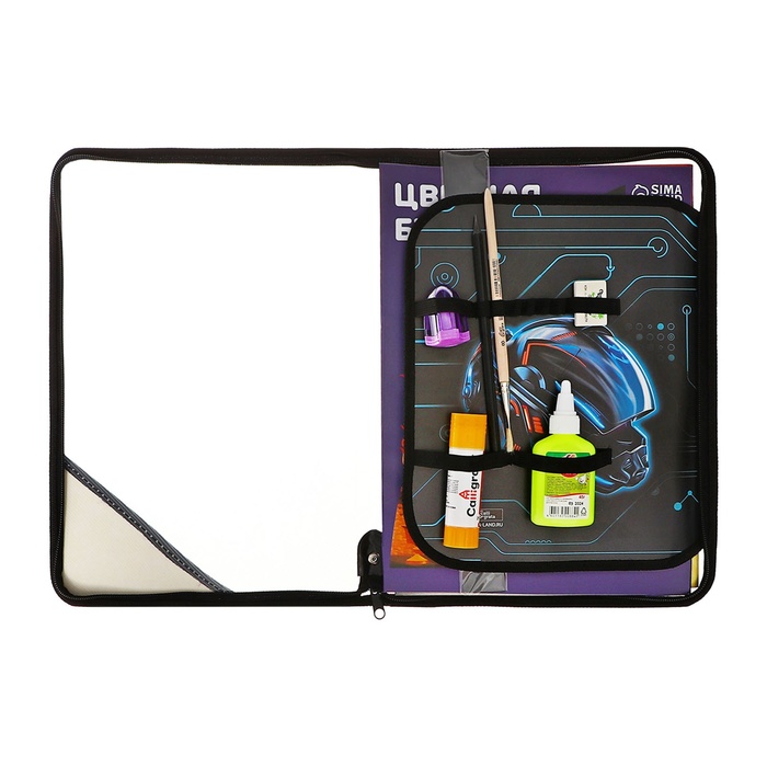 - Широкие возможности для творчества: В комплекте находятся карандаши, линейка, ножницы и клей, которые помогут воплотить любые детские идеи в жизнь. Каждый инструмент имеет свое место в папке, поддерживая порядок и организацию.