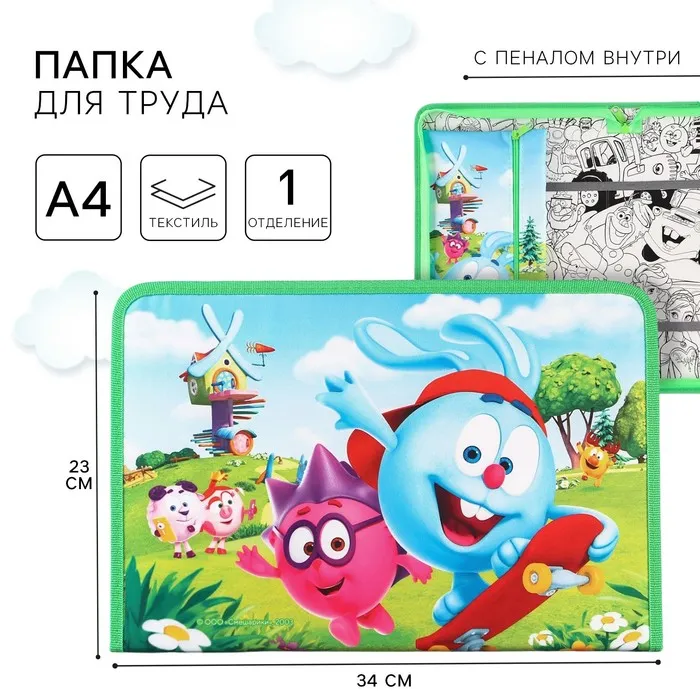 Папка для труда А4 с пеналом, на молнии, текстиль, «Смешарики» — Характеристики
