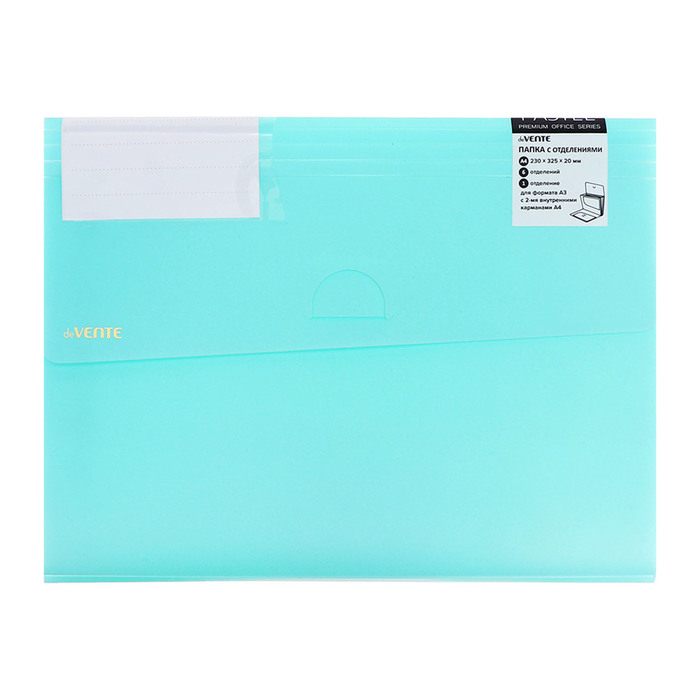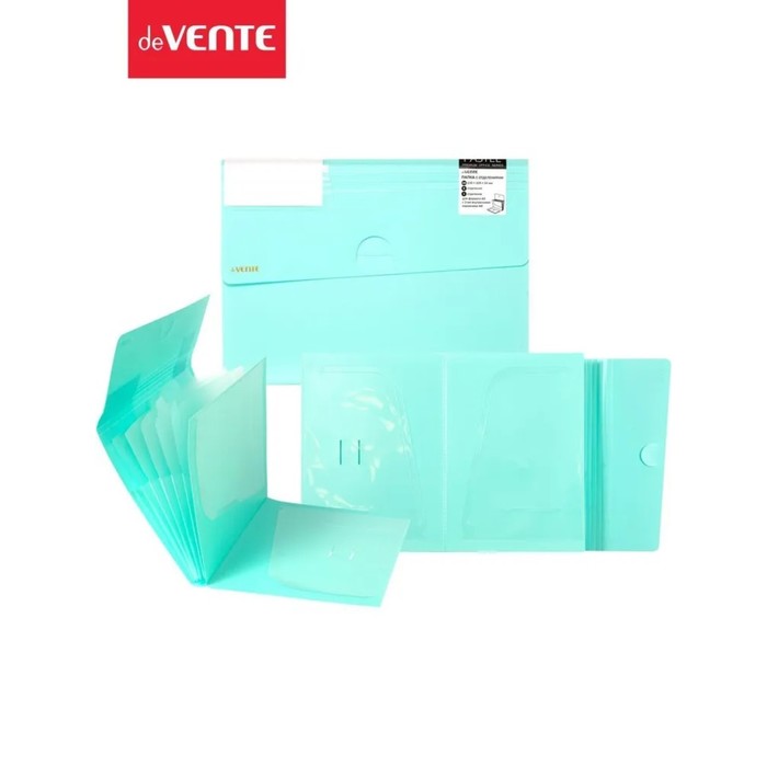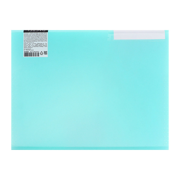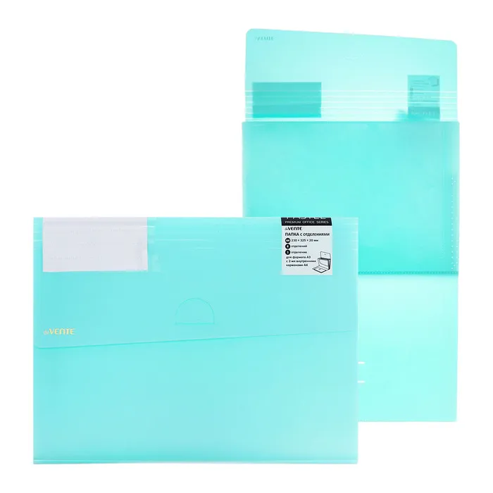 Папка с клапаном с 6-ю отделениями "deVENTE. Pastel" A4 (325x230x20 мм) 550 мкм, фактура "песок" 1 отделение A3 с 2-мя внутренними карманами 160 мкм, индивидуальная маркировка, непрозрачная бирюзовая.