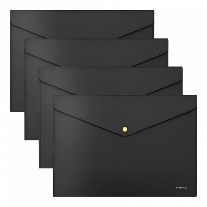 Папка-конверт на кнопке формата А4 из высококачественного непрозрачного пластика с текстурой поверхности "песок", на которой не видно отпечатков пальцев и мелких царапин. Предназначена для хранения и транспортировки небольшого количества документов. Цвет папки - чёрный; цвет фурнитуры - ассорти: желтый, оранжевый, зелёный, розовый. Надежная застежка-кнопка обеспечивает быстрый доступ к документам. Папка вмещает до 120 бумажных листов. Размер - 232х333мм, толщина - 0.18мм. Код и баркод на каждой единице товара