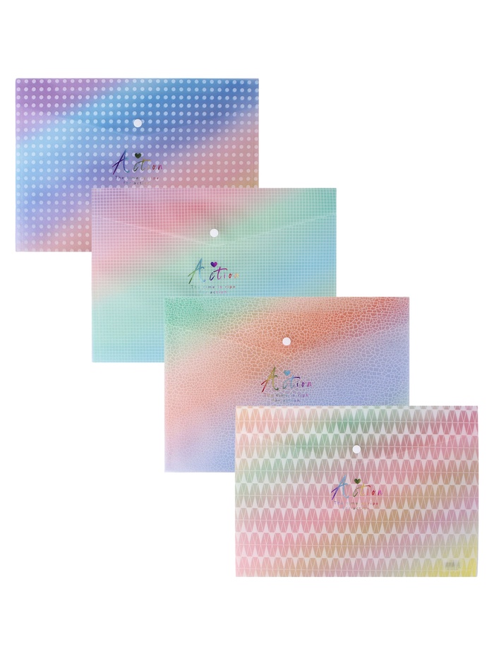 Папка-конверт на кнопке формата Travel из высококачественного полупрозрачного пластика с текстурой поверхности "зеркало", на которой не видно отпечатков пальцев и мелких царапин.