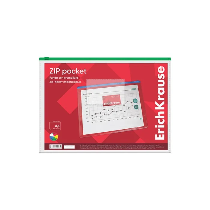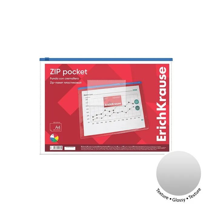 Папка-конверт на ZIP-молнии А4, 140 мкм, ErichKrause PVC Zip Pocket, прозрачная, до 100 листов, микс — Характеристики