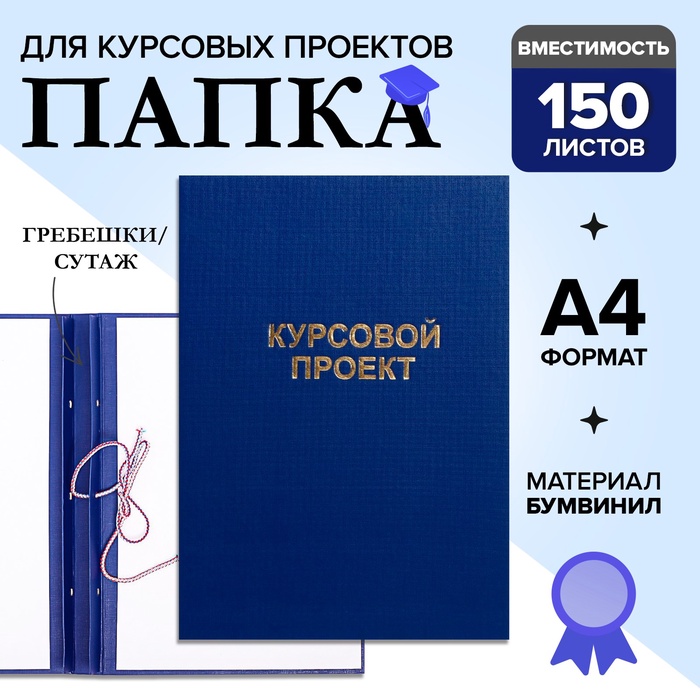 Папка «Курсовой проект» А4, бумвинил, гребешки/сутаж, без бумаги, синяя, (вместимость до 150 листов) — Характеристики