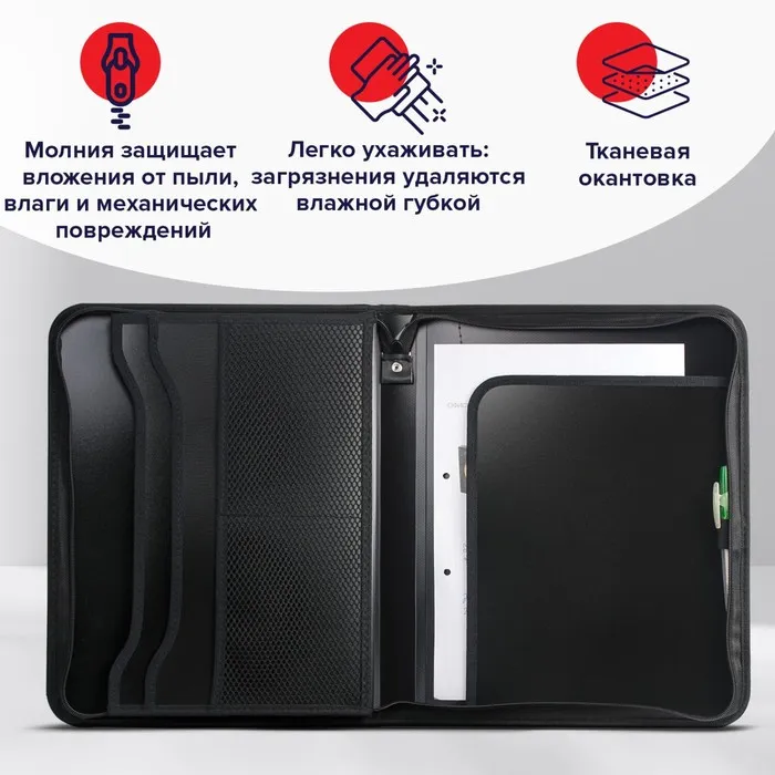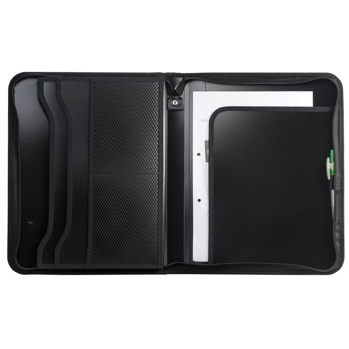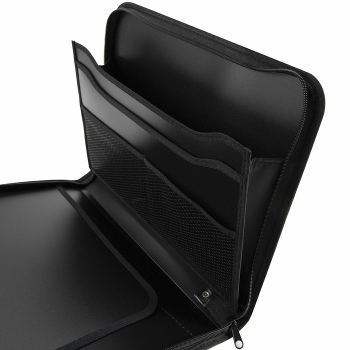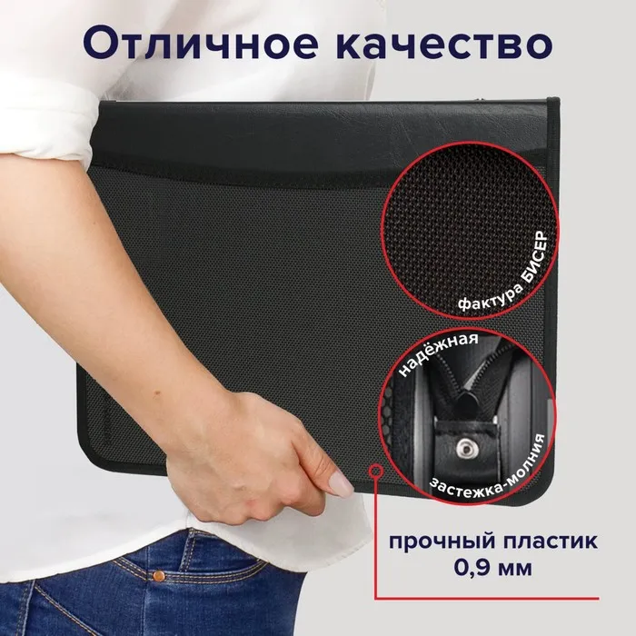 Папка на молнии Calligrata предназначена для переноски документов, а также их хранения. Незаменима в работе и учебе, в командировках, деловых поездках, путешествиях. Изготовлена из прочного черного полипропилена толщиной 0,9 мм с фактурой "бисер". Формат А4 (350х282 мм). Имеет два внутренних отделения и четыре кармана. Надежный замок-молния защищает документы от механических повреждений, а также пыли и влаги. Цвет молнии - черный. Важные документы и ценные бумаги всегда требуют повышенного внимания и деликатного обращения. Их безопасность и опрятный внешний вид обеспечит папка Calligrata. Организовать деятельность сотрудников, нацеленную на высокий результат, помогут товары нашего интернет-магазина!