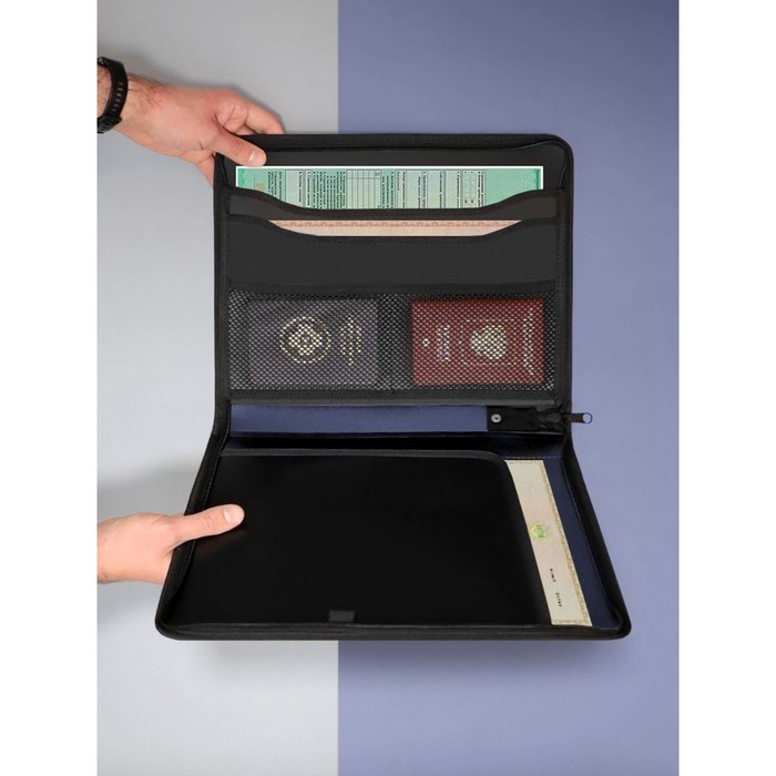 Папка на молнии Calligrata предназначена для переноски документов, а также их хранения. Незаменима в работе и учебе, в командировках, деловых поездках, путешествиях. Изготовлена из прочного черного полипропилена толщиной 0,9 мм с фактурой "бисер". Формат А4 (350х282 мм). Имеет два внутренних отделения и четыре кармана. Надежный замок-молния защищает документы от механических повреждений, а также пыли и влаги. Цвет папки - серный металлик. Важные документы и ценные бумаги всегда требуют повышенного внимания и деликатного обращения. Их безопасность и опрятный внешний вид обеспечит папка Calligrata. Организовать деятельность сотрудников, нацеленную на высокий результат, помогут товары нашего интернет-магазина!