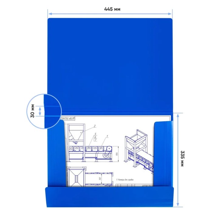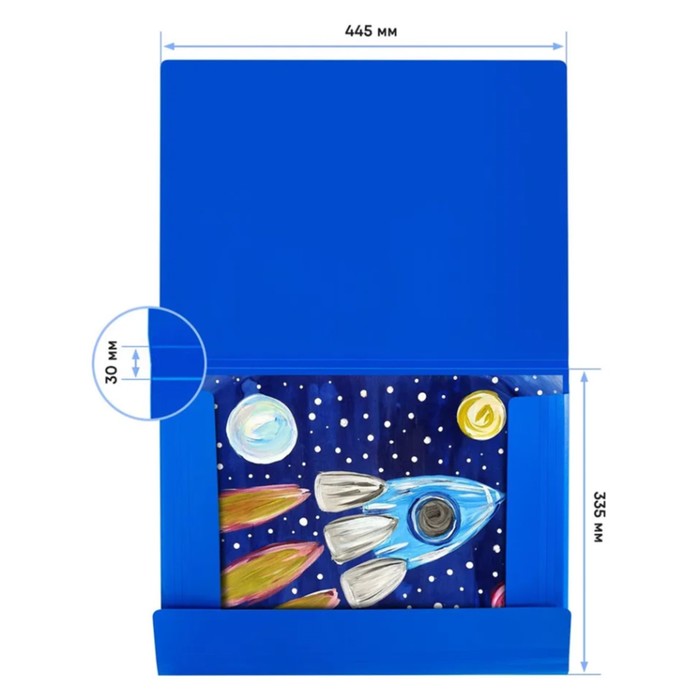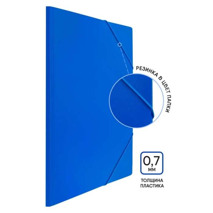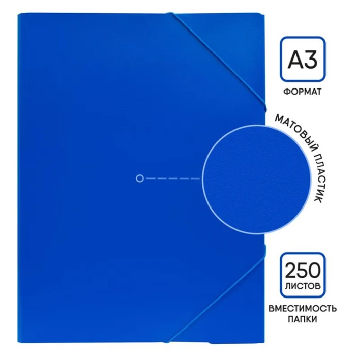 Папка с резинкой формата А3 синего цвета — практичное решение для хранения и транспортировки документов большого формата. За счёт плотного пластика толщиной 700 мкм изделие сохраняет форму и обеспечивает надёжную защиту от повреждений и загрязнений. Вертикальный дизайн удобно использовать для организации бумаг в офисе, учебе или творческих проектах.